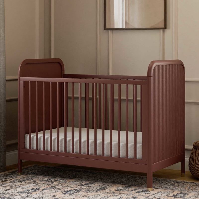 The Brimsley Tambour Crib is a masterpiece of craftsmanship that blends timeless design with modern functionality. Its distinctive tambour design and gently curved slats, paired with elegant gold feet, make this crib more than just a place for your little