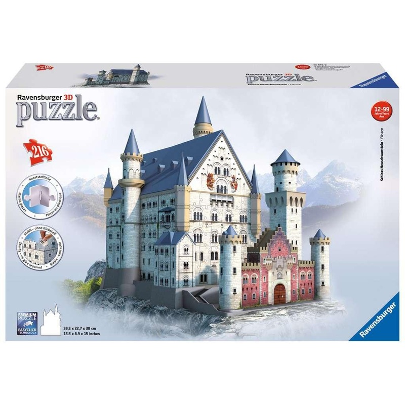 Germanys Neuschwanstein Castle was made famous by Disney and remains one of the most recognizable icons in the world. Construct an exact replica in amazing 3D using 216 carefully-constructed plastic puzzle pieces, including curved and hinged pieces that interlock to create a perfect copy of one of Europes most famous landmarks! Start at the base and work your way up display your finished model or disassemble and enjoy the challenge of building again. Pieces are numbered for easy assembly. For ages 10 and up. WARNING: CHOKING HAZARD – Small Parts. Not for children under 3yrs.