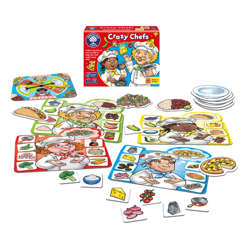 The game can be used to get children interested in cooking by talking about the different ingredients and utensils, as well as foods from around the world. The addition of the spinner turns Crazy Chefs into a game of chance to see who will cook their meal first!