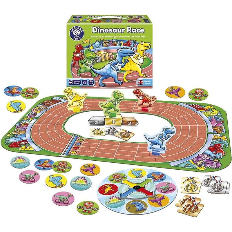 Race for your position on the podium to collect a shiny medal! In this exciting game of chance, all the dinosaurs move simultaneously towards the finish line to collect a bronze, silver or gold medal! Players take it in turns to spin the four ended spinner, which tells each player which dinosaur cards to look out for on the table. Everyone must then count up the matching cards and move this many spaces along the track. Who will race into the lead?