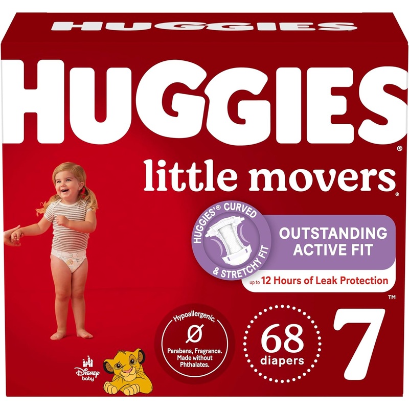 Huggies Size 7 Diapers, Little Movers Baby Diapers, Size 7 (41+ lbs), 68 Count Huggies Little Movers Baby Diapers are designed to stay in place through active play! These disposable baby diapers are designed for worry-free running, jumping and playing with