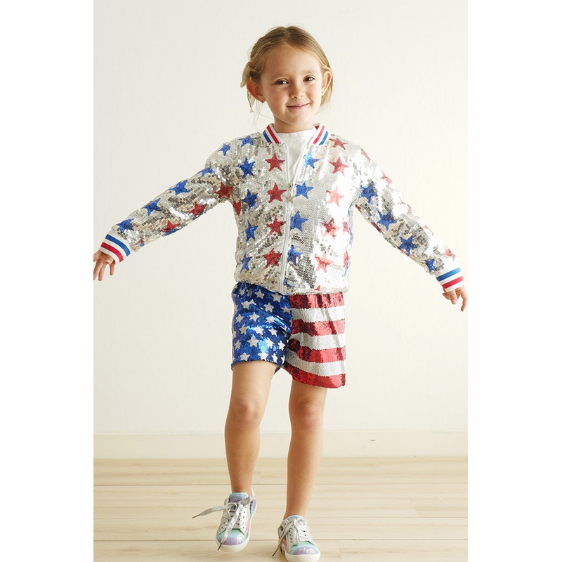 Get your sparkle on with these patriotic sequin girl shorts! Perfect for Fourth of July parties or any celebration, these shorts are sure to make a statement. The sequins add a touch of glam while showing off your American spirit. Shine bright like a firework in these shorts!