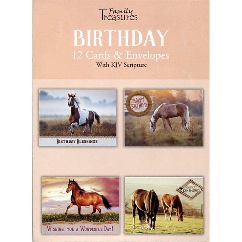 These Peaceful Moments Birthday Boxed Cards are perfect for horse lovers! Each card features a peaceful image of a horse in a meadow along with a birthday wish and Bible verse.12 cards and envelopes3 each of 4 designsKing James Version ScriptureFolded Card