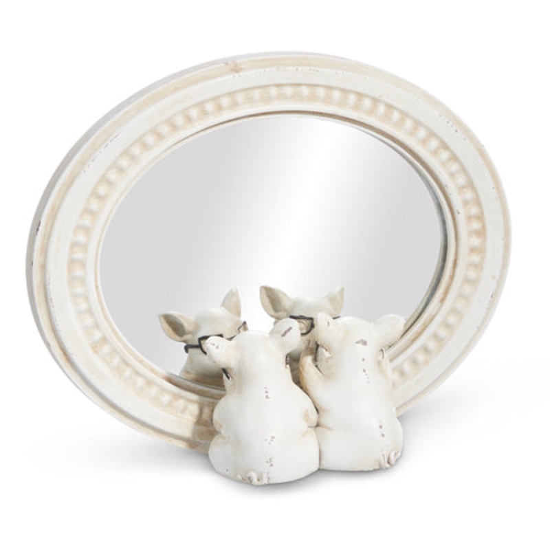This Pig with Glasses Mirrored Decor will add a whimsical touch to any room. It features a cream colored rustic frame with two pigs with glasses staring at their reflections.Material: resin, glassDimensions: 8.75"L x 4.75"W x 6.75"H