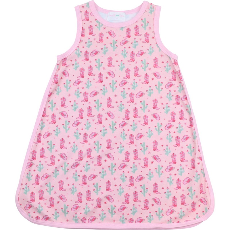 Yeehaw! Keep your little cowgirl cool and stylish with our Pink And Green Knit Rodeo Play Dress. Featuring a fun and vibrant western print filled with pink cowboy boots, hats, stars, and cacti, this dress is perfect for sunny days, outdoor adventures, and