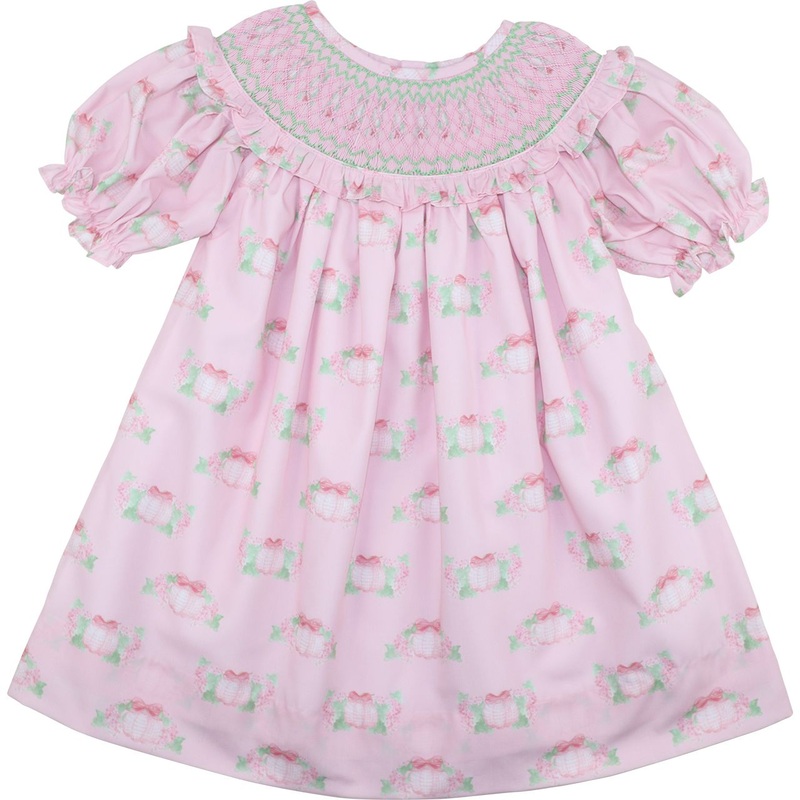 Add a touch of seasonal sweetness to your little girls wardrobe with our Pink And Green Smocked Pumpkin Print Dress! This charming short-sleeve dress features a soft pink backdrop adorned with watercolor-style pumpkins wrapped in pretty pink bows and green foliage. The hand smocked neckline adds dimension and elegance. Perfect for festive fall outings, family photos, or twirling through crisp autumn days in style.