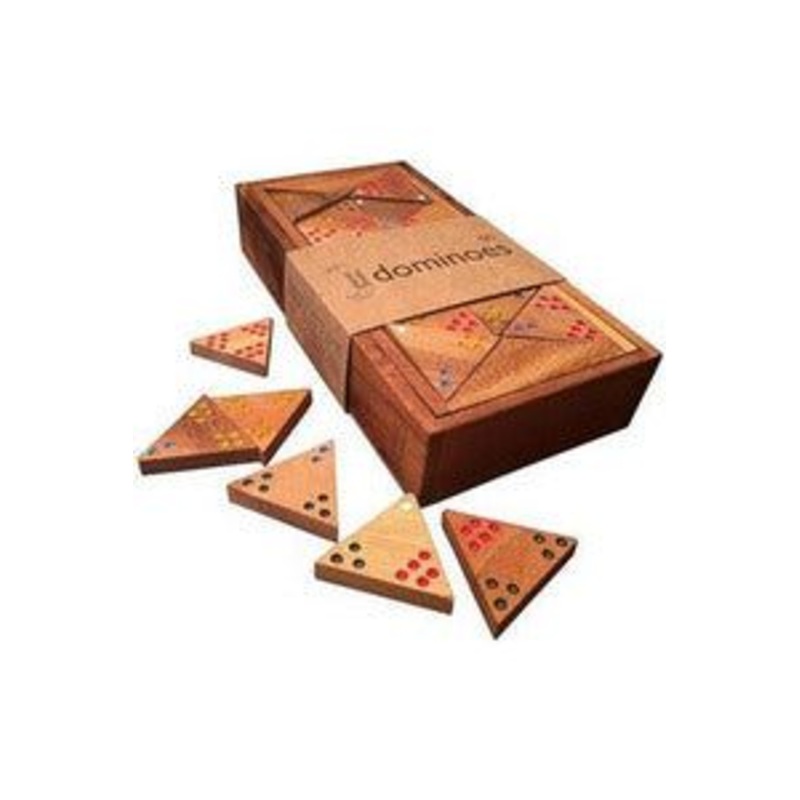 This fun set of tri dominoes has 56 handpainted triangular hardwood tiles beautifully presented in a timber box with lid.With three sides that can match, tri dominoes is a more challenging version of this classic table game.Build bridges and hexagons for added bonus points.Each set includes tiles with all numerical combinations from one to five and comes with easy to understand rules.