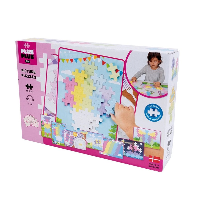 Plus-Plus Big is perfect for smaller hands or bigger ideas. This picture puzzle includes 60 pastel color big pieces and 7 puzzle flash cards. Every puzzle has two sides - a challenge and a solution.Plus-Plus is a creative construction toy for hours of play