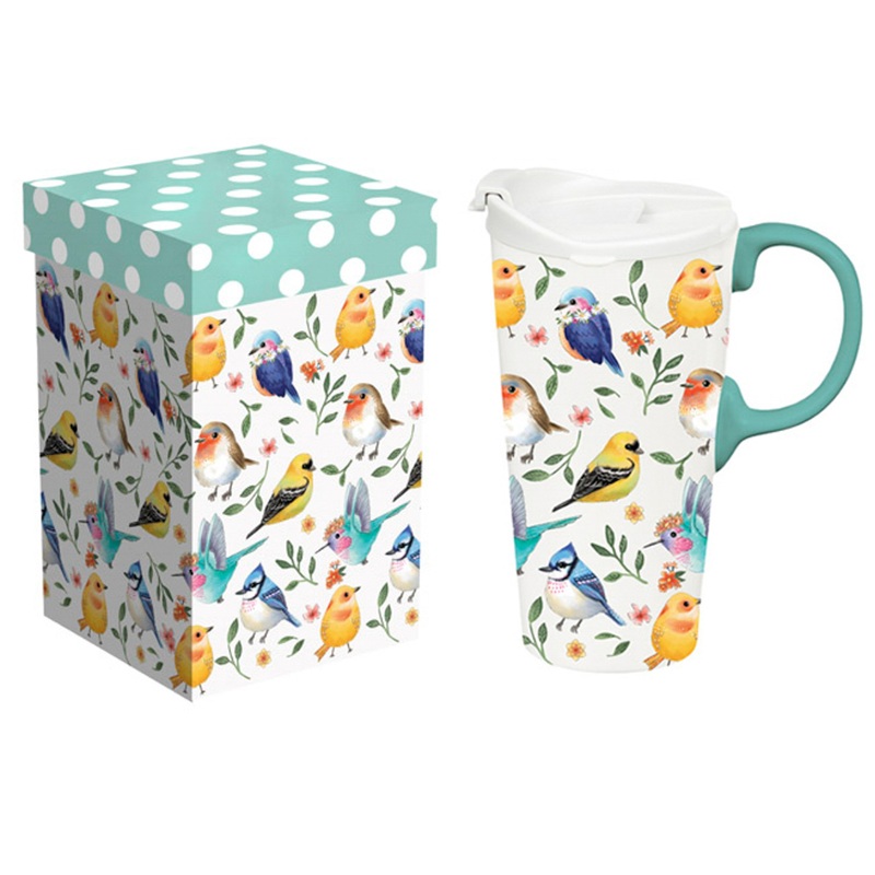 Enjoy your coffee on the go with this Positively Playful Birdies Ceramic Travel Cup! This charming mug is perfect for cold or hot beverages. It features a delightful and vibrant bird design with a turquoise handle and a white flip-top lid with a silicone seal that prevents leaks. It even comes in a coordinating box for a lovely gift presentation!