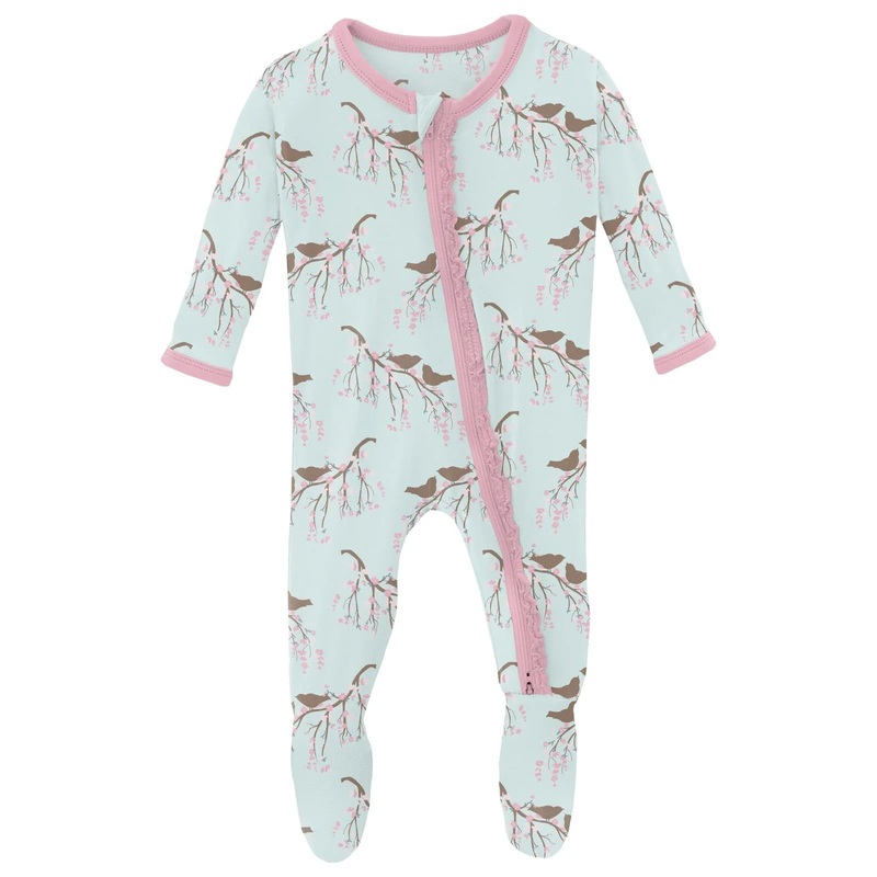 Good news! Our beloved Ruffle Footie now comes with a 2 way zipper! All the same comfy, ruffly goodness, with the ease of a zipper for quick changes. Our sweet fitted Footies feature flip 'paws' to cover chilly hands and prevent scratching. The inside of t