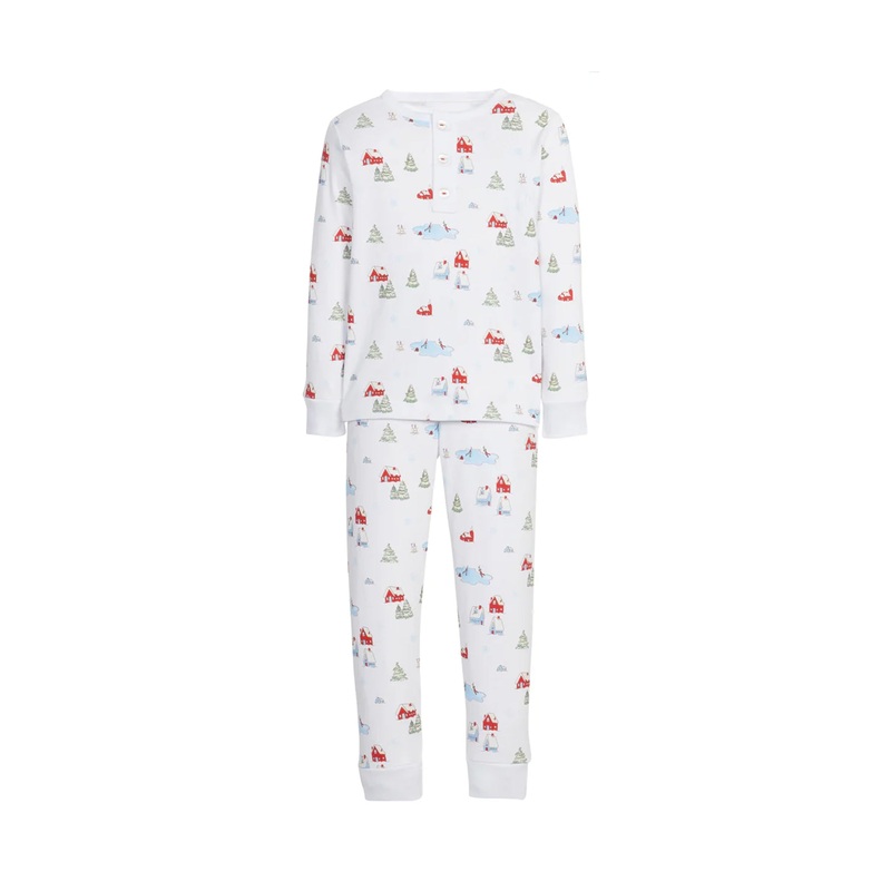 Shannon Latham founded Little English in 2004 with the belief that children should always be well-dressed. Employing hand-smocking, hand-embroidery, and the very best fabrics, Shannon and her daughter design timeless pieces that will be worn for generations to come. The Printed Jammies in Candy Cane Lane features an adorable snowy home, and skating rink print in reds and greens, just right for the season.