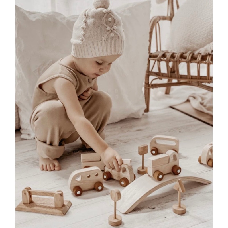 A wooden mini vehicle play set is a classic and timeless toy for young children. Made from sustainably sourced wood, this play set features a collection of 7 miniature vehicles, including cars, trucks, . Each vehicle is carefully crafted with intricate details, encouraging imaginative and creative play. The set include 7 vehicles of different types, a bump gate, traffic signs, bridge and storage box that functions as a garage.