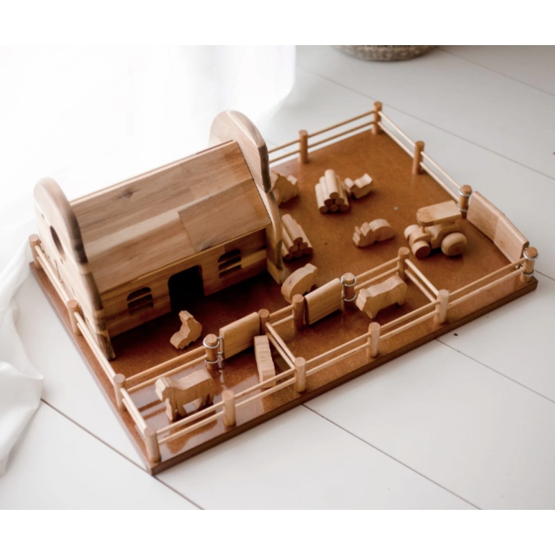 This beautifully made wooden barn house is perfect for pretend play. It is a signature piece in any setting. The house features a good size and a solid structure with the fence around it. It includes all the animals and tractor as can be seen in the pictur
