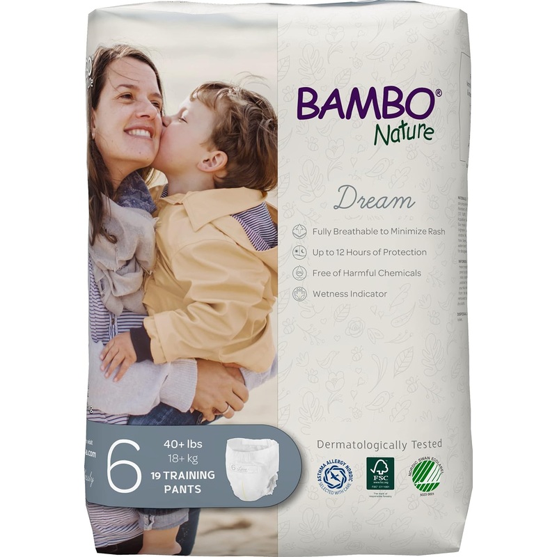 Bambo Nature Premium Training Pants (SIZES 4 TO 6 AVAILABLE), Size 6, 190 Count Bambo Natures eco-friendly, disposable training pants are free of harmful chemicals, all known allergens and now the fluff pulp is made TCF (totally chlorine-free). These train