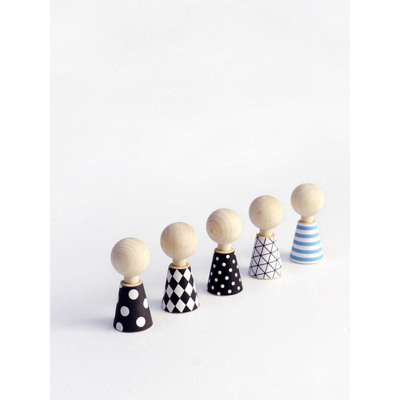 tiny wooden dolls with the best wardrobe. your little one with have lots of dress up fun with easy stick-on & reusable clothes.modern pebbles set includes36 bold &chic paper clotheswith contemporary patternsin monochrome and basic colorsthis set includes 5