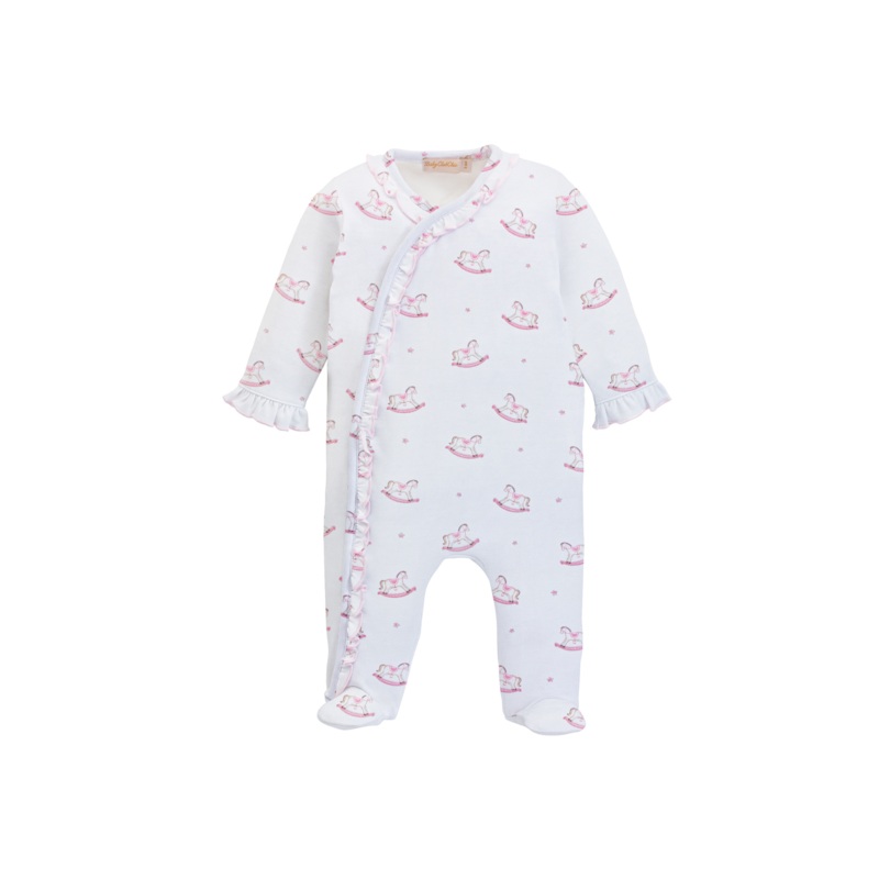 Horsing around. Made from the absolute softest pima cotton, this Rocking Horse Pink Footie features a fun all-over rocking horse print, an easy snap closure, and the sweetest pink ruffle trimit’s truly the perfect onesie.