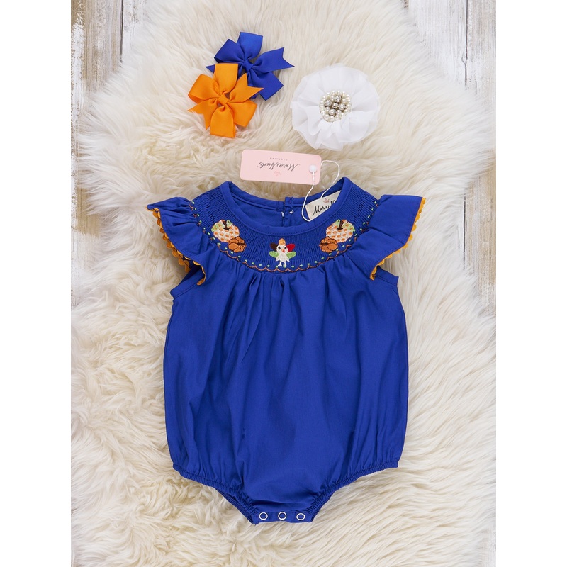 This Royal Blue & Orange Embroidered Ruffle sister set is a sibling-style sensation! Your stars will shine in this coordinated sister set, featuring embroidered turkeys & pumpkins and ruffle-licious sleeves. Perfect for all your pumpkin-picking, turkey-eating festivities! The elasticleg holes areperfect for your little turkey’s chunky legs!