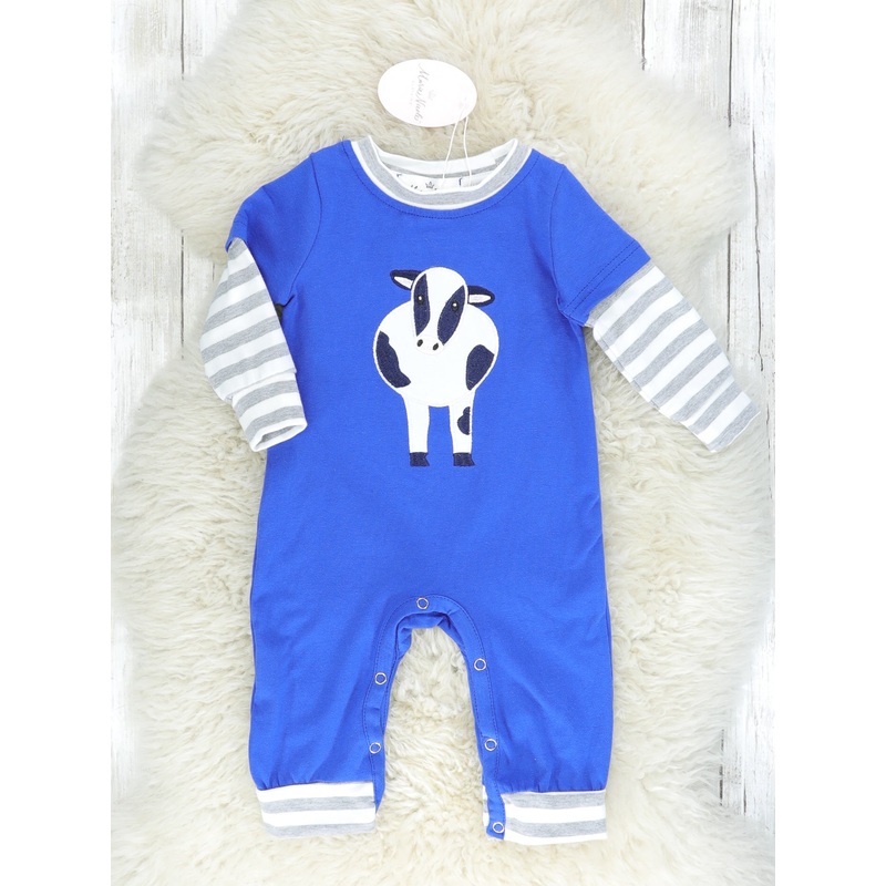An aMOOsing romper for little guys! This blue romper features an adorable cow appliqu, grey striped sleeves, & matching striped trim.