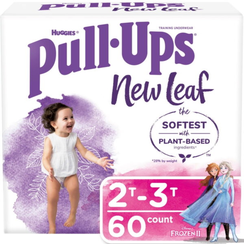 Huggies Pull-Ups New Leaf Girls' Disney Frozen Potty Training Pants, 60 Ct, 2T-3T (16-34 lb.) Introducing Pull-Ups New Leaf Training Pants, the softest training underwear made with plant-based ingredients for healthy skin. Clinically proven to be hypoaller