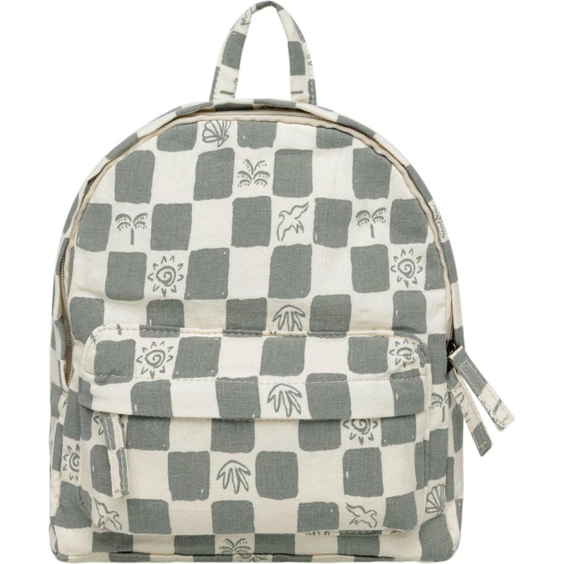 This mini backpack has a main zipper compartment, a front pocket for extra snacks and gadgets, shoulder straps, and a top handle for all ways your little one wants to carry it.Featuring our coastal check print on our natural hue. This watercolor check is g