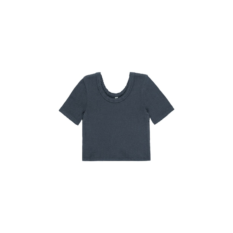 Our Scalloped Tee will be your versatile staple this fall, crafted from pointelle knit fabric and adorned with scalloped sleeves and neckline.Featuring our 'indigo' colorway.Care: Machine wash cold. Lay flat to dry.Made of 78% Nylon, 22% Elastane