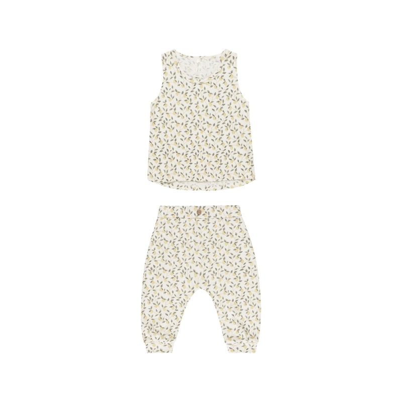 This ultra soft cotton jersey set comes with a sleeveless tank and coordinating slouch pants with button detail.Featuring our 'lemons' print on our 'ivory' hue. This citrusy sweet print is giving Italian coastal vibes.Care: Machine wash cold. Tumble dry lo