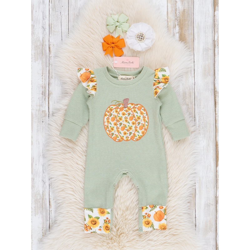 Your minis will bloom in this sister set. Perfect for a trip to the pumpkin patch, this girls romper features waffle knit fabric in a serene shade of sage, with charming pumpkin accents and delicate ruffle detailing. Perfect for any autumn occasion!