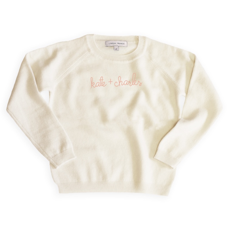 Each saying or phrase on Lingua Franca's staple pullover sweaters is chalked in script by designer Rachelle Hruska MacPherson before it's ever stitched. Made from the softest cashmere, the Say My Name Kids Crewneck can be adorned with one of the brand's si