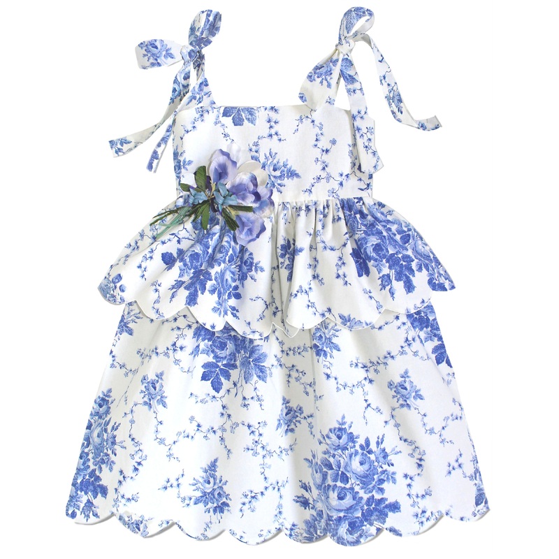 Widely known for her quilted jackets, Lindsey Berns one-of-a-kind collections for women and children are a celebration of artisan quality and vintage fabrics, captured in flattering, contemporary style. TheEternal Flower capsule collection features all-over floral print dresses,handcrafted and sustainably made from rare vintage fabrics. The Scallop Peplum Petal Dress in Blue Toile de Jouy in aromantic and fanciful vintage Laura Ashleyprint featureshand-cutsoft scalloped edges, hand-tied long ribbon shoulder bows, andanantique millinery flower pinned onto the waistline. Your little one could not look cuter.
