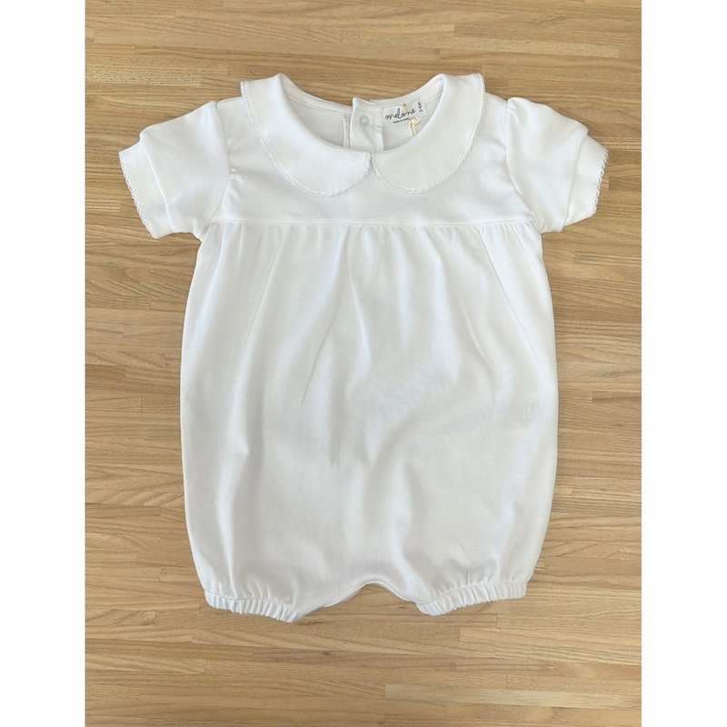 Between your adorable baby and the chic white color, this romper nears cuteness overload! Its made from 100% pimacotton that's gentle on tender skin, featuring a peter pan collar thats detailed with delicate white pique trim for an oh-so-sweet finish. Elas