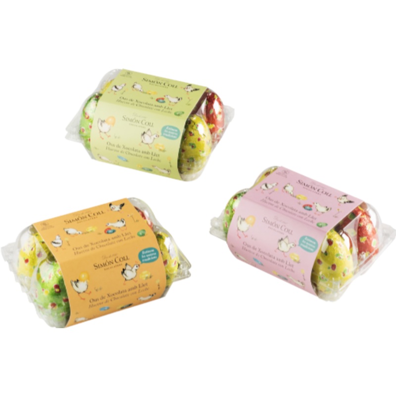 Egg-cup with 6 milk chocolate tinned eggs, all of them covered with aluminum and an Easter chick design. For those who love the creaminess and the flavour of Simn Coll milk chocolate. Our chocolate is gluten-free, made with natural ingredients and without