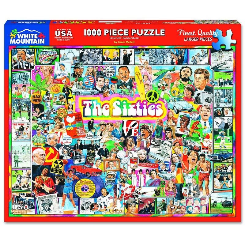Artist James Mellett has stretched his talents to the limit to reignite our memories of and appreciation for the very stimulating era of the 60’s. Includes icons popular from The Sixties as well as many still popular today, like “I Have a Dream” Speech, Anti war movement, The Man from U.N.C.L.E., the Vietnam War, the 1st Rolling Stone Magazine, the Boston Celtics, Joe Namath, Green Bay Packers, Johnny Carson, .Janis Joplin, Barbra Streisand, James Bond, and many more. How many do you recognize? For ages 10 and up. WARNING: CHOKING HAZARD – Small Parts. Not for children under 3yrs.