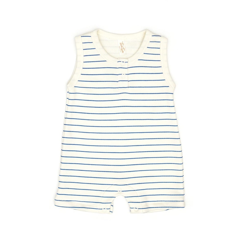Get your little one ready for stylish fun in the sun with this Sleeveless Romper. With a cute henley design and trendy blue stripes, they'll be the coolest baby on the block. Perfect for any summer adventure, this romper is a must-have for your little fash