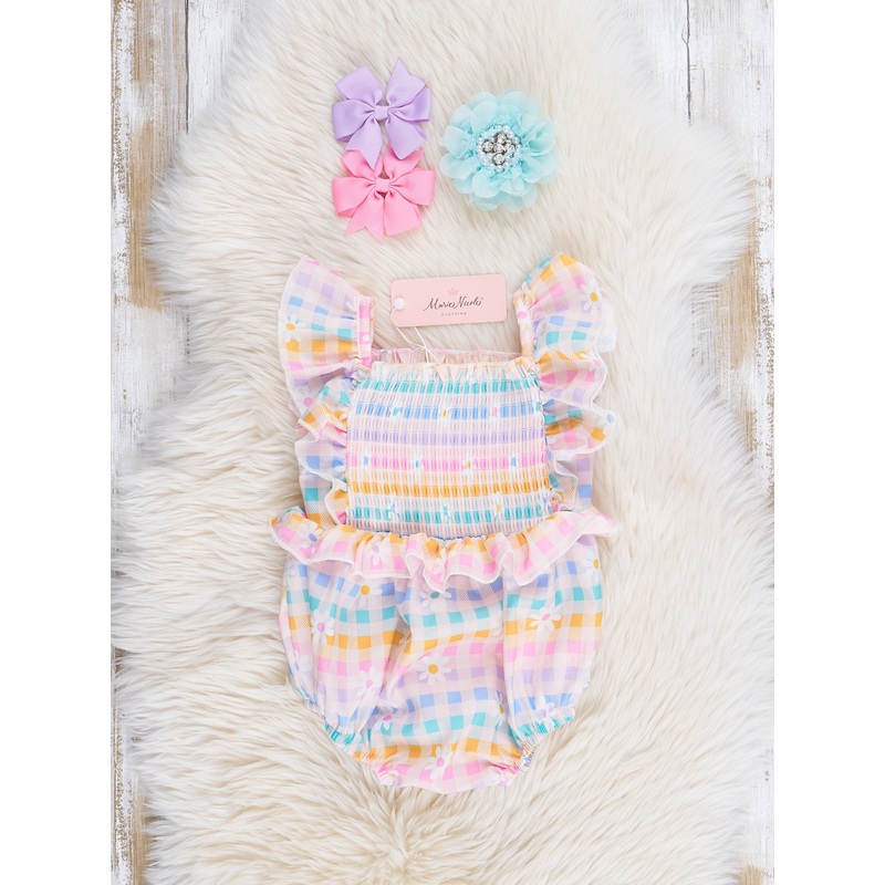 Get ready for a groovy day with our Smocked Rainbow Stripes & Blooms Ruffle Romper. Perfect for sisters, this set features a playful smocked design, dainty embroidered flowers, and sweet ruffle trim.