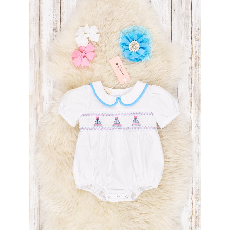 Let your little ones cruise the seas of fashion inthissisterset! Featuring a classic peter pan collar and smocking adorned with embroidered sailboats, thisromperwill give your little sailors a timeless, adorable look!