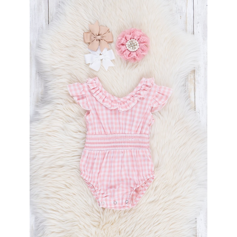 Thissweet sister setis perfect for spring & summer! This bubbleromperfeatures coral gingham, ruffle trim, smocking, & flutter trim.Snap buttons.Fits true to size.Cotton top / Polyester bottoms.Accessories sold separately.Import.Afterpay and Sezzle Purchase