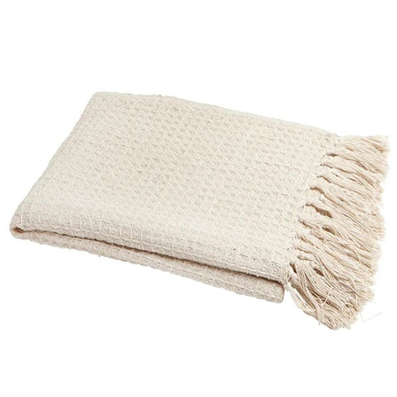 Curl up in this cozy Soft Waffle Throw Blanket. It features a large, soft waffle design with a delicate fringe edge. Available in neutral shades to blend with any decor.Material: cottonDimensions: 50 x 60 inchesFringe edgeMachine washable
