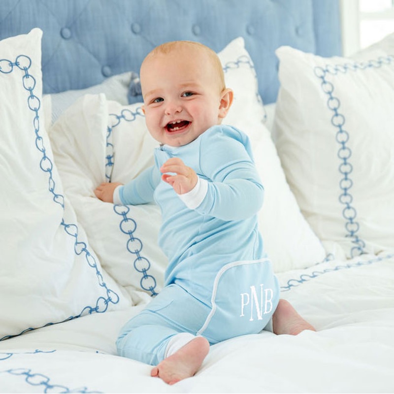 Your little one will be comfortable dreaming in this Solid Blue Zip Sleeper.Theblueknitonesieis the softest and most comfortable for your little one! Perfect for all seasons! Easy zip-up front zipper! Backflap is sewn down. Selected sizes available footed