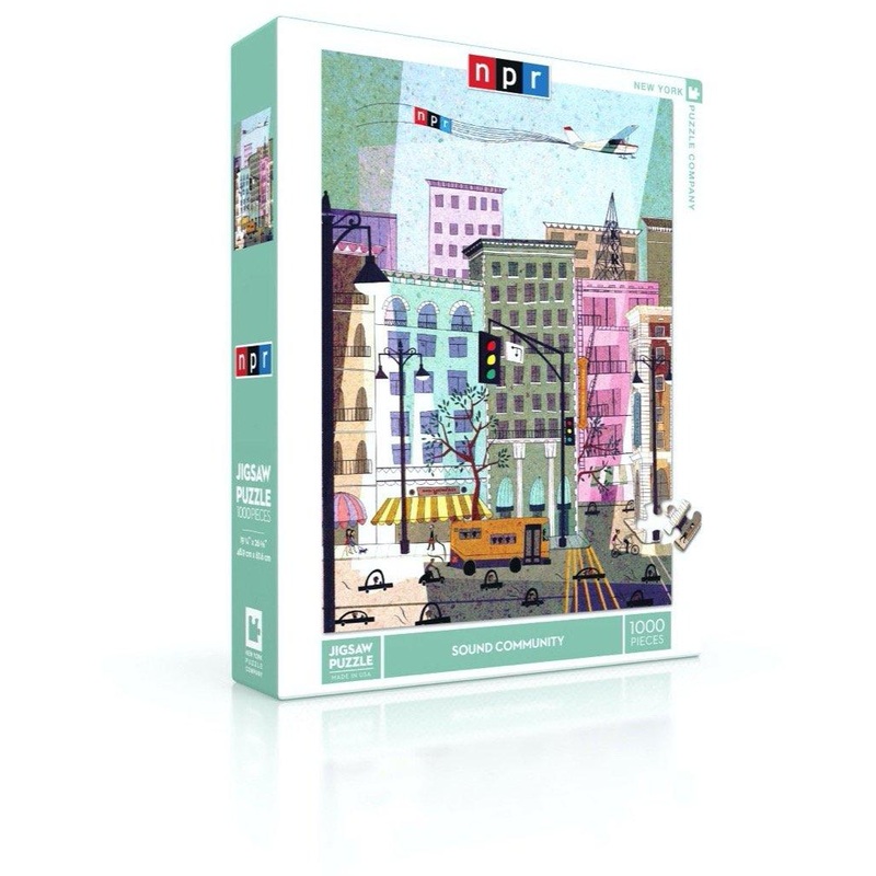A lively playful urban residential scene. Vehicles including a city bus and a tandem bicycle navigate the streets while pedestrians and a pet dog move along the sidewalks. In the sky a plane flies over a radio tower trailing an NPR banner. For ages 10 and up. WARNING: CHOKING HAZARD – Small Parts. Not for children under 3yrs.
