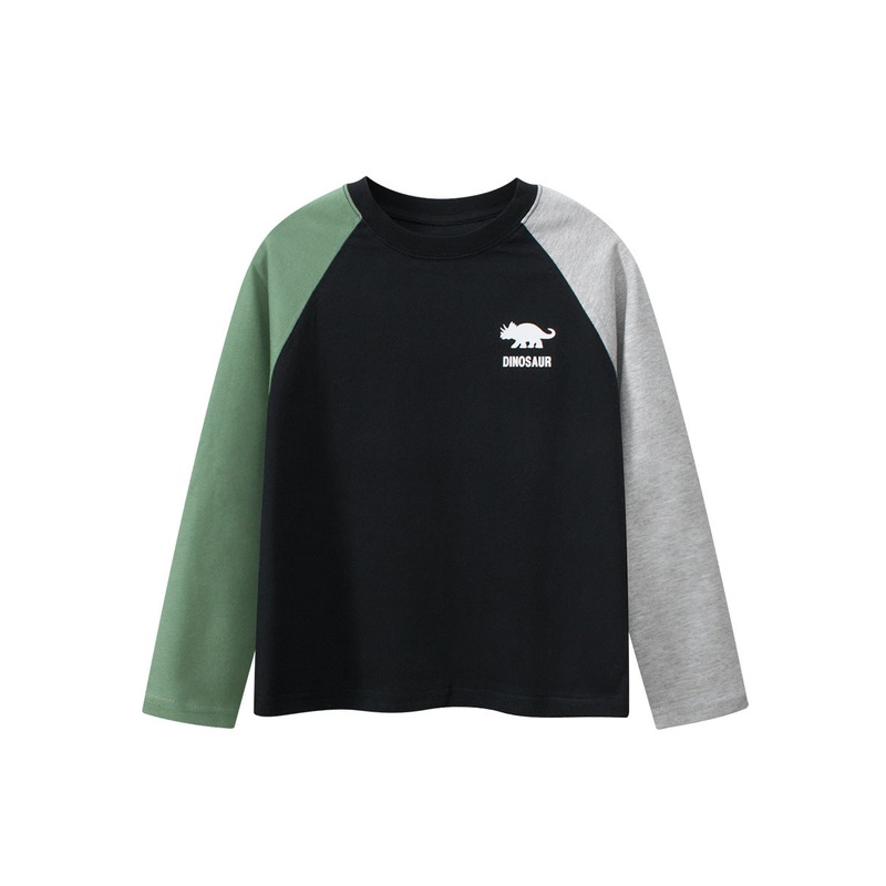 Introduce your little one to stylish comfort with our Spring Arrival Kids Dinosaur Logo Crew Neck Long Sleeves Color Patchwork Top. Made with soft, breathable fabric and featuring a playful dinosaur logo on a color patchwork design, this top will keep your
