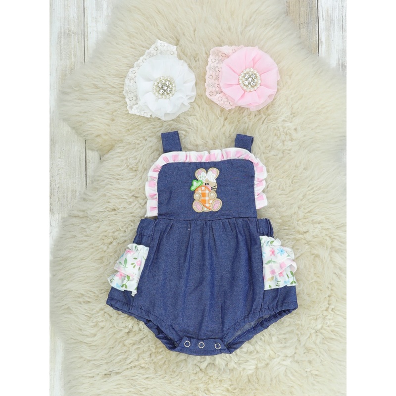 The cutest sister set for your hunny bunnies! This chambray bubble features floral ruffles, a bunnyappliqu, and a bow on the back.