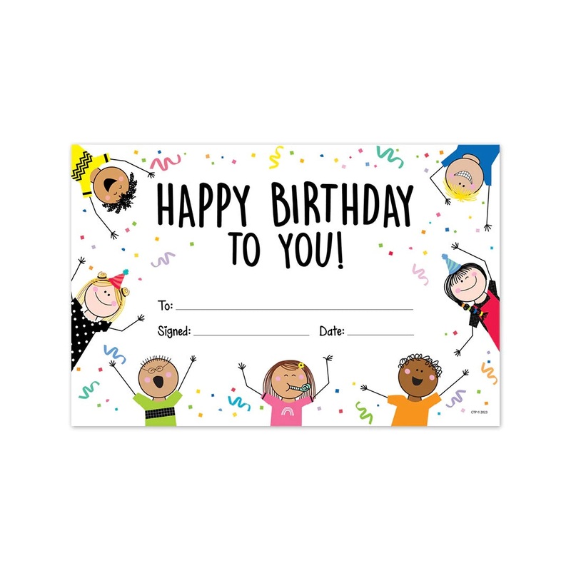 Celebrate birthdays with these colorful awards featuring the multicultural Stick Kids. Awards are printed on sturdy paper stock so students can enjoy them for years to come.30 colorful awards per package.