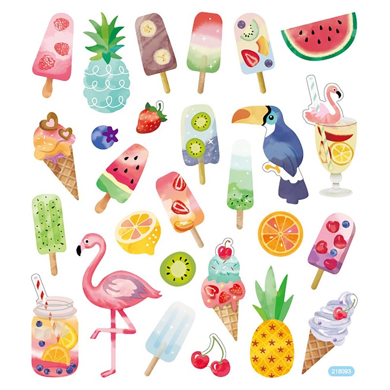 This colorful and delicious sheet of stickers perfectly embellishes cards, scrapbook pages, or other children's crafts. This sheet of stickers features tropical birds, ice cream, and other treats.Acid and lignin freeAges 3+Package contains one sheet of sti