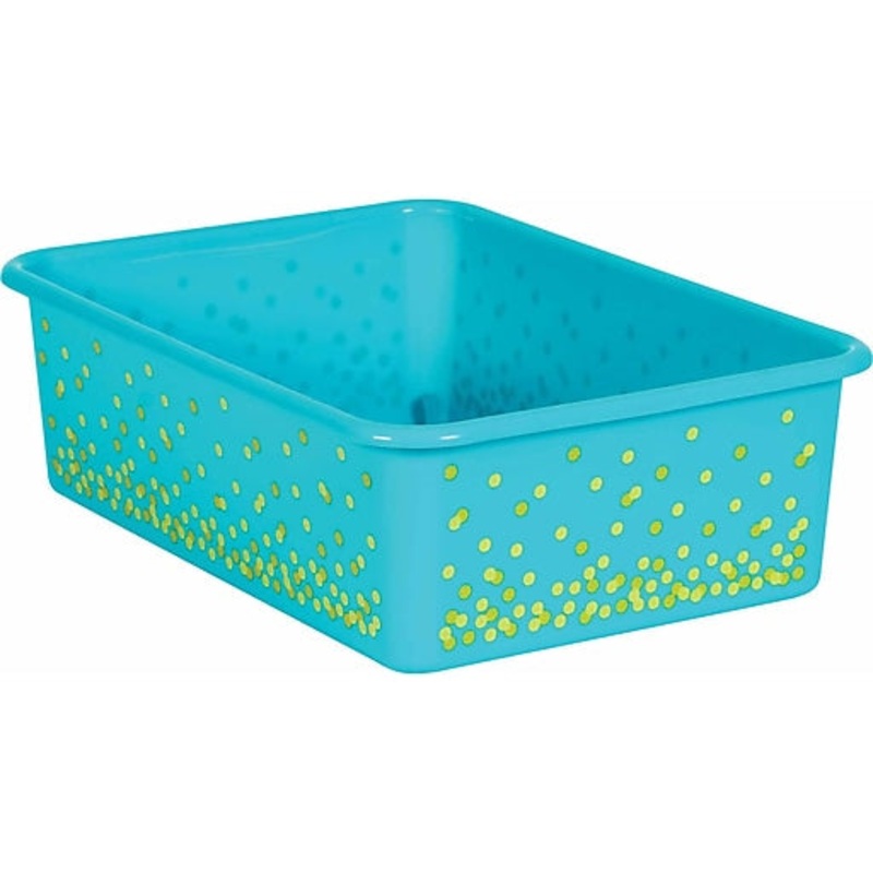 Storage Bin Large Teal ConfettiDescriptionCreate a beautifully organized classroom with this Teal Confetti Large Plastic Storage Bin. Keep books, notepads, toys, games, and supplies in these decorative organizers that feature a sturdy plastic design.Each b