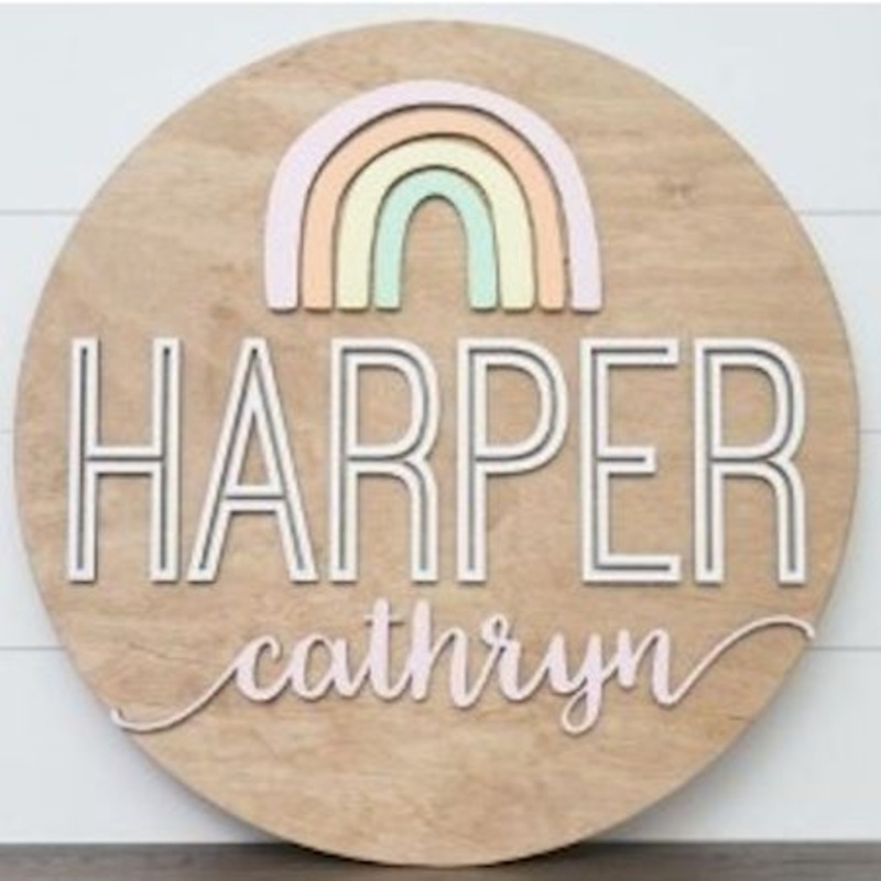 At the end of the rainbow is your little pot of gold! This custom round rainbow sign showcases your childs name in your font and letter colors of choice to give that personal touch to your dream nursery!MEASUREMENTS24" diameterBackground 1/2" thickLetters