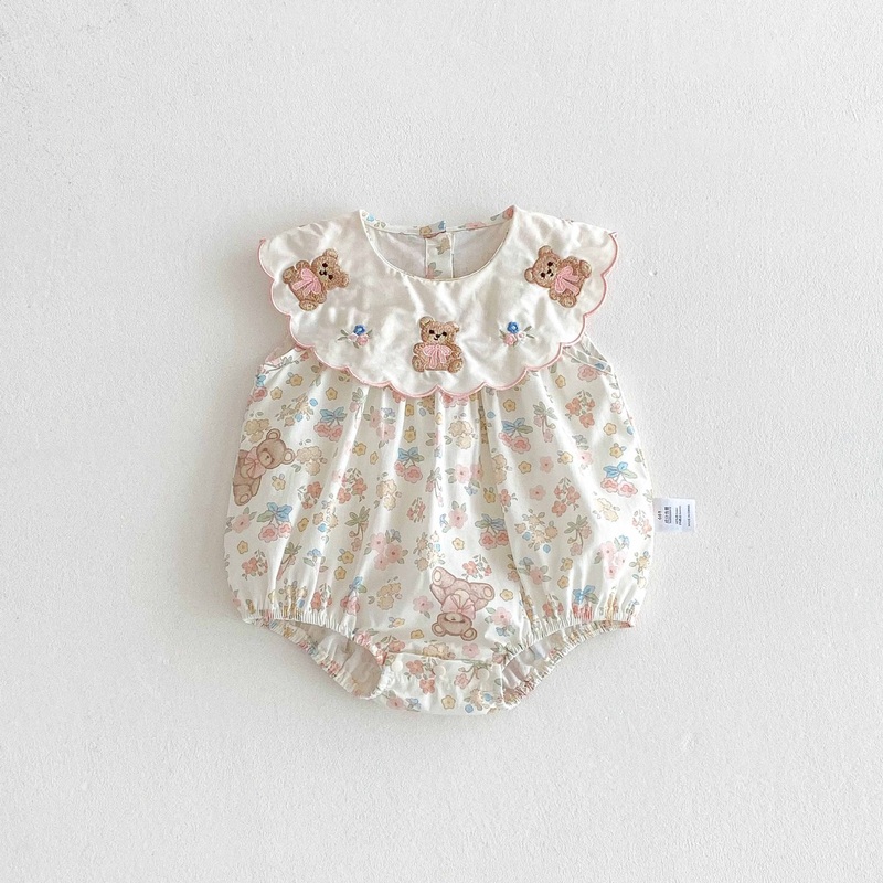 This sleeveless onesie features an adorable teddy and floral pattern, perfect for welcoming summer with style and comfort. Crafted for baby girls, it offers a lightweight, breathable fit that keeps your little one cool during warm days. The charming design