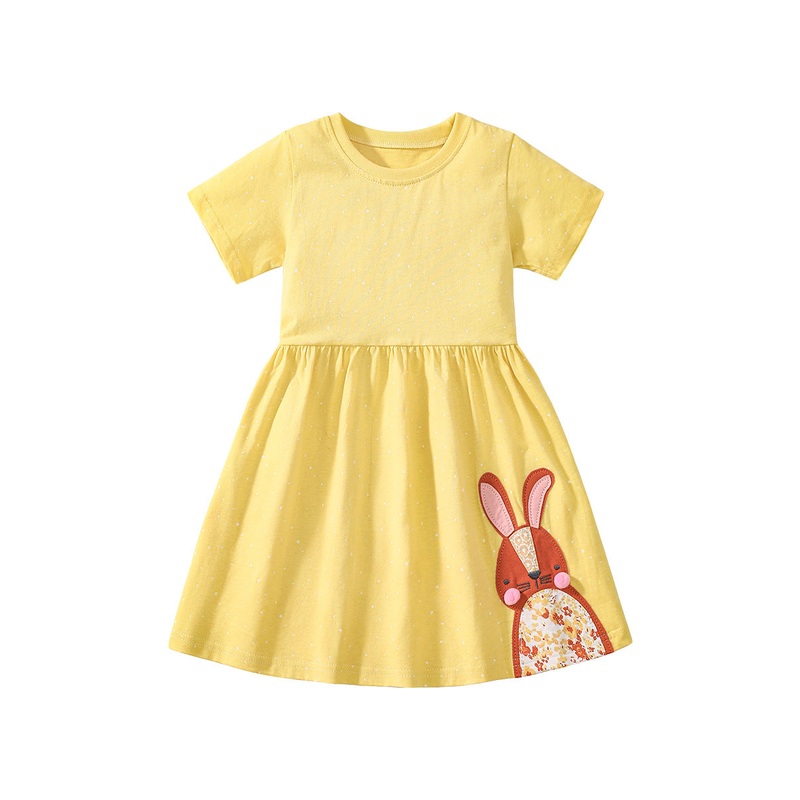 Summer Arrival Girls Rabbits Pattern Crew Neck Short Sleeves Yellow Dress