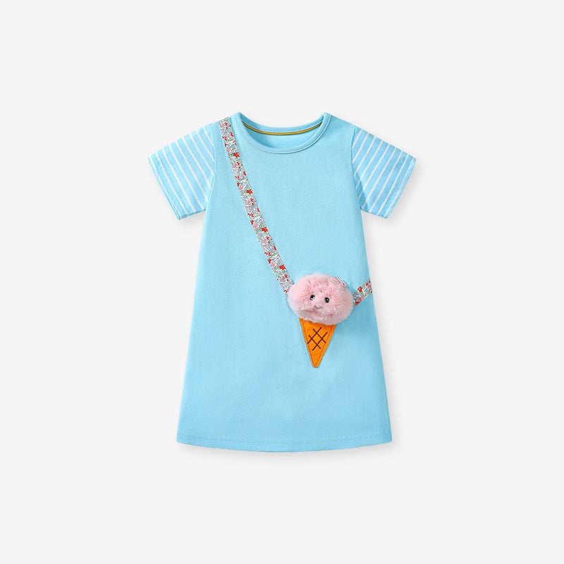 This charming short-sleeve dress features a playful ice-cream cartoon pattern, perfect for stylish girls embracing the summer season. Crafted for comfort and ease, it combines a light, breathable fabric with a fun design, making it an ideal choice for warm
