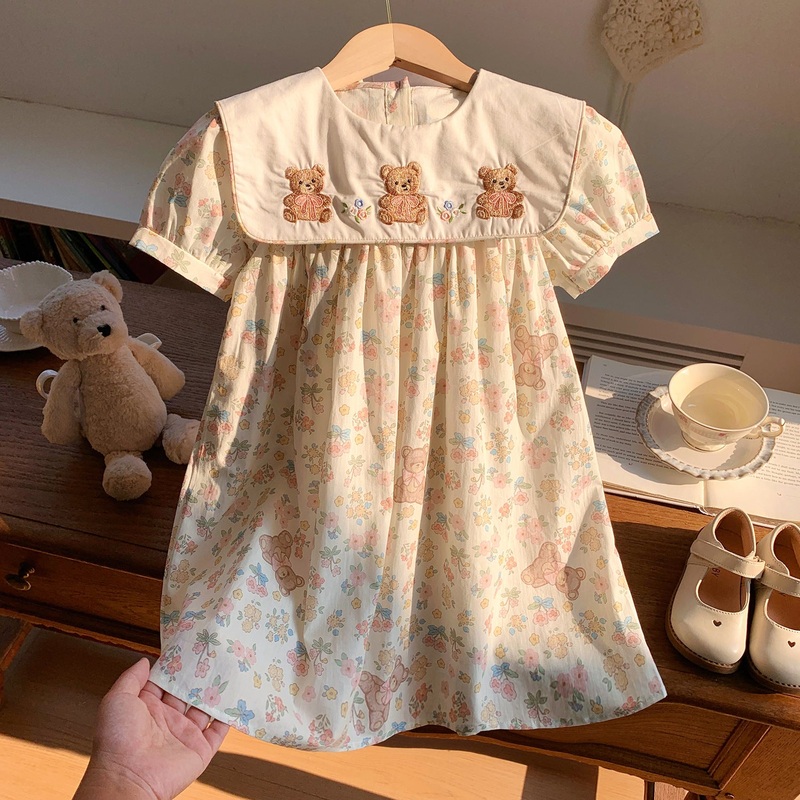 GWIL528532245Summer Baby Kids Girls Short Sleeves Crew Neck Teddy Bear Pattern Floral Dress