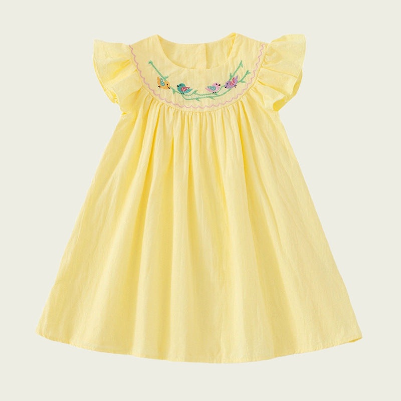 Summer Baby Kids Girls Sleeveless Birds Embroidery Yellow Dress